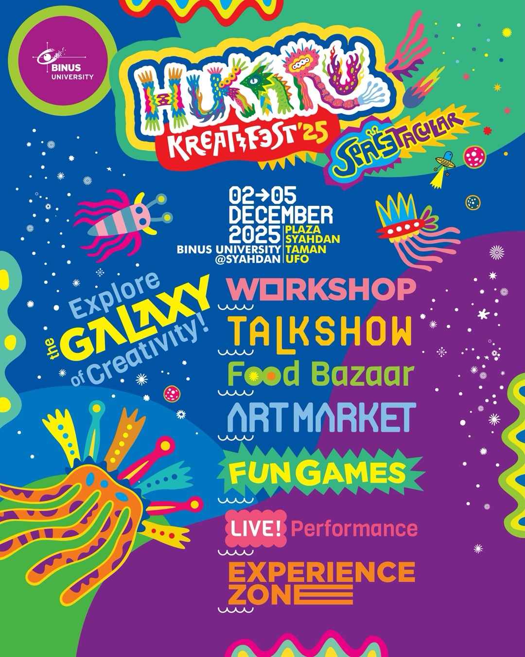 BINUS School of Design, bersama Student Support Office dan Business Center BINUS University, menggelar HUKARU Kreatifest 2025 pada 2–5 Desember 2025. Festival seni dan ilustrasi yang berlangsung selama empat hari ini mengangkat tema “Spacetacular”, sebuah konsep yang memadukan imajinasi ruang angkasa dengan semangat kreativitas tanpa batas. Tema tersebut menjadi benang merah yang menghubungkan rangkaian program mulai dari workshop, talkshow, hingga kompetisi ilustrasi.
